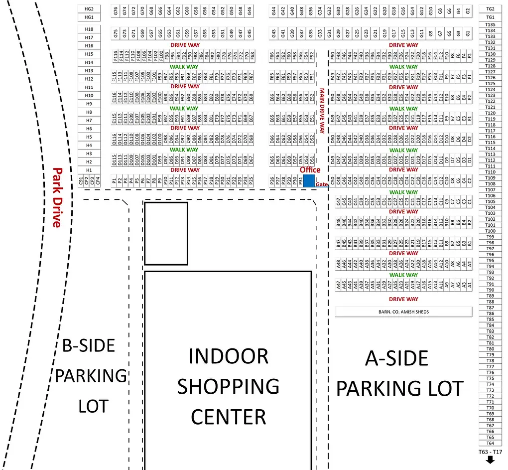 Our Outdoor Flea Market Map is your compass for a seamless and delightful shopping spree. All spaces are generously sized at 12 x 30, with convenient vehicle parking behind each spot. With this map in hand, you’re in for a hassle-free journey through the market’s lively layout and amenities.
